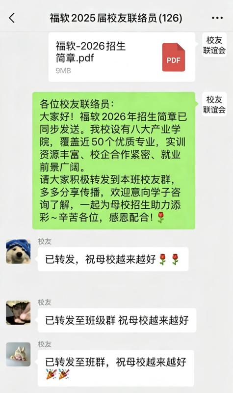 本次招生助力行动中,校友联谊会坚持线上广覆盖、线下深渗透的工作思路,全方位、多维度推送招生信息。线上依托校友联络体系,将最新招生宣传手册精准转发至各学院校友负责人、学生校友联络员等专属群组,通过校友圈层高效传播,扩大宣传覆盖面与触达率。